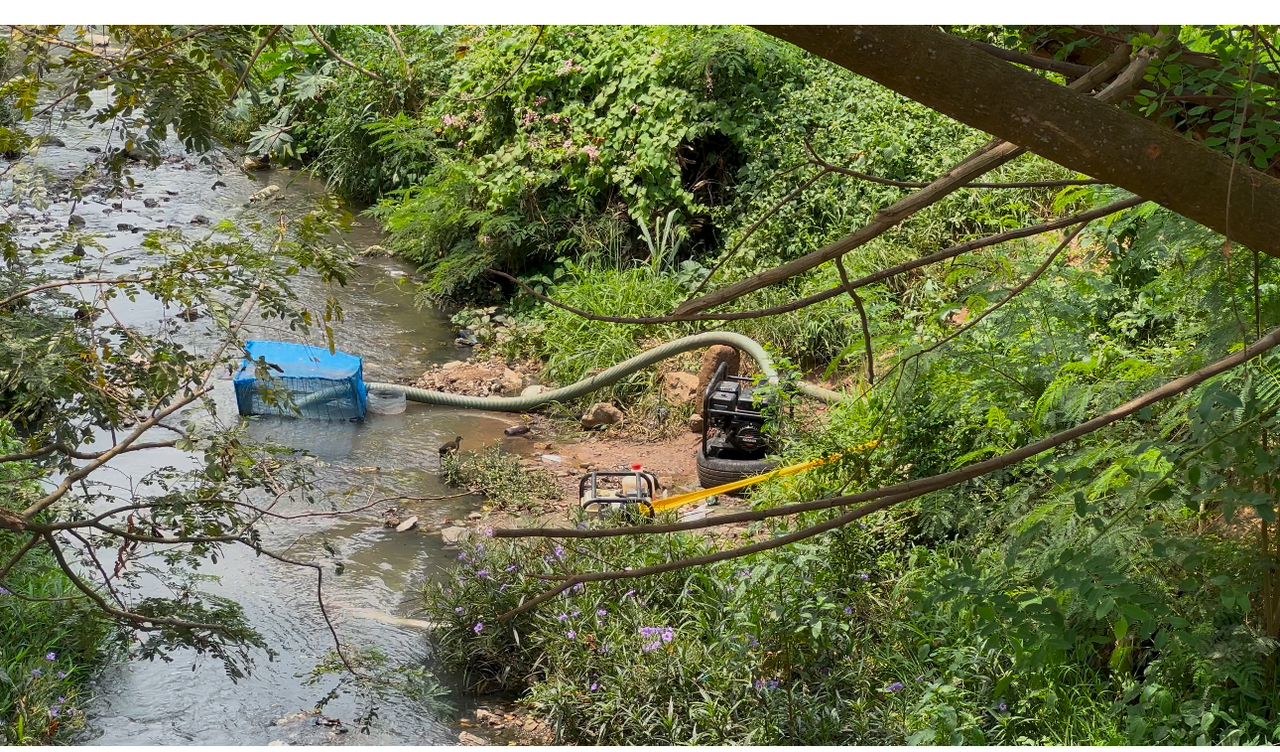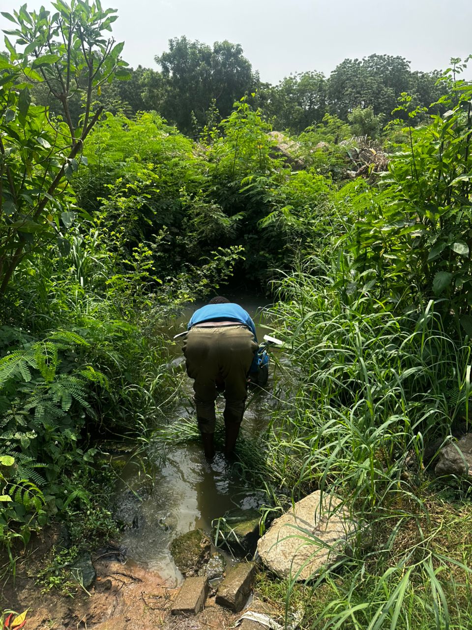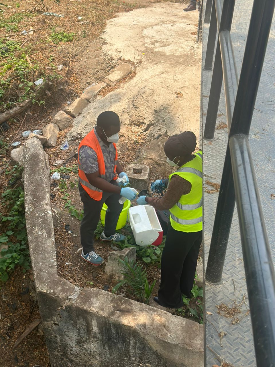 At the drain, some farmers had already connected pumps to extract water for irrigation. The stench was overwhelming, and the water was visibly contaminated with waste. Samples were carefully taken and transported to the lab for analysis.