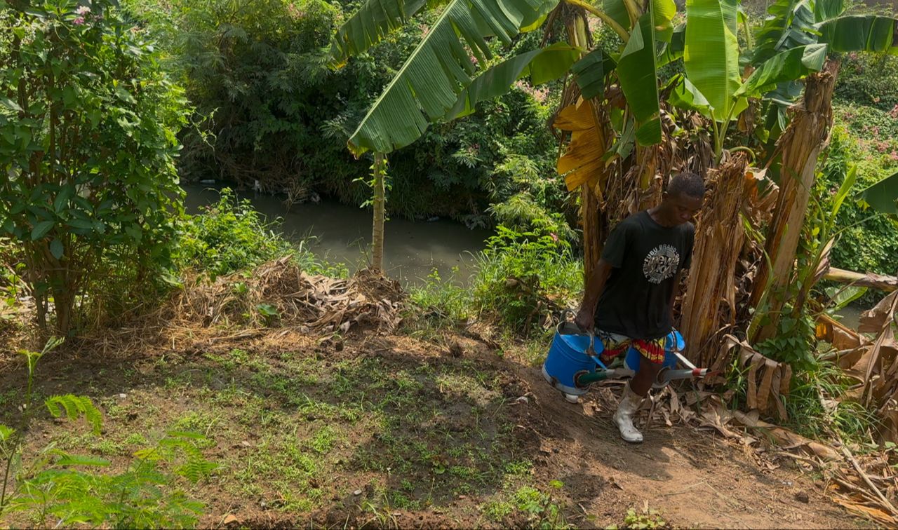 At a small vegetable farm near a heavily polluted drain in Accra, 49-year-old Peter Kwoffie Arhin bends over a row of leafy greens, carefully watering them with a can. The water he uses comes straight from the stagnant drain beside his farm, murky, dark, and filled with floating debris.